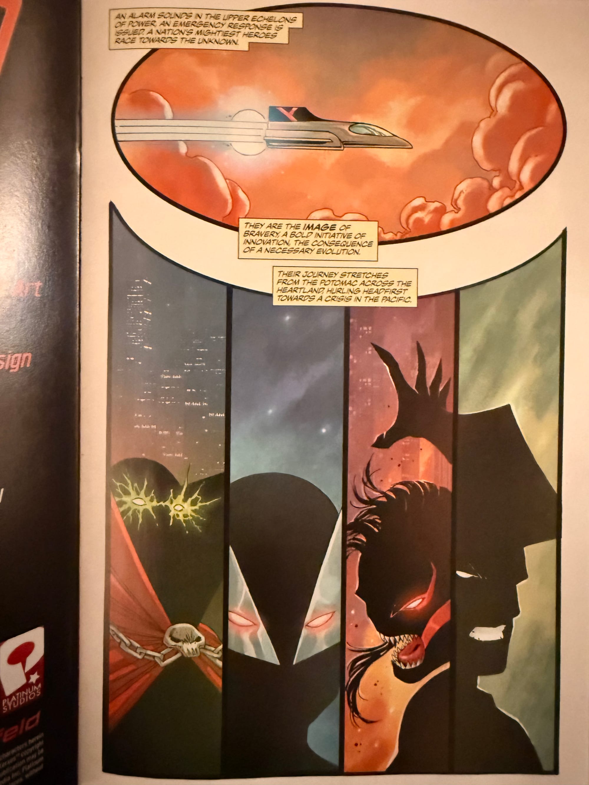 The new Youngblood relaunch opens with a beautiful homage to the Image Comics rebellion of 1992 — featuring a full slate of icons soaring across page one: Spawn, ShadowHawk, Ripclaw, Savage Dragon, and the Youngblood squad above it all.